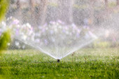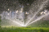 Zdjęcie "Zraszacz wody trawnikowej rozpylający wodę nad trawnikiem zielona świeża trawa w ogrodzie lub podwórku w upalny letni dzień. Koncepcja automatycznego nawadniania, konserwacji trawnika, ogrodnictwa i narzędzi." może być wykorzystywane do celów osobistych i komercyjnych zgodnie z warunkami zakupionej licencji Royalty-free. Obraz jest dostępny do pobrania w jakości wysokiej rozdzielczości do 5760x3840.