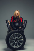 Moda, sport, ekstremalne. Rowerzysta dziewczyna ubrana w sprzęt motocyklowy, leżąc na podłodze z kołami samochodu w studio.