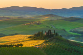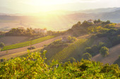 Panzano winnic Chianti i panorama o zachodzie słońca w jesieni. Toskania, Włochy Europy.
