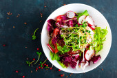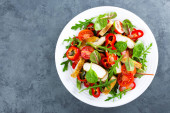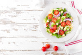 Sałatką ze świeżych warzyw z mięsem grillowanym kurczakiem, widok z góry