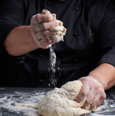 Szef kuchni w czarnym mundurze ugniata biały ciasta pszenicznego nad stołem