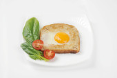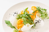 Widok z góry z jajecznicy z pomidorów cherry i awokado w płycie na szarym tle