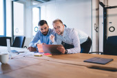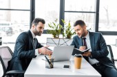 laughting przystojny biznesmenów w pobliżu laptopa w nowoczesnym biurze