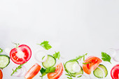 Zdjęcie "Wegańskie jedzenie koncepcja. Składniki do gotowania wiosna witamina sałatka. Świeże warzywa prosty wzór, układ z pomidorów, cebuli, zioła i przyprawy na białym tle. Widok z góry transparent kopiować przestrzeń" może być wykorzystywane do celów osobistych i komercyjnych zgodnie z warunkami zakupionej licencji Royalty-free. Obraz jest dostępny do pobrania w jakości wysokiej rozdzielczości do 5760x3840.