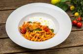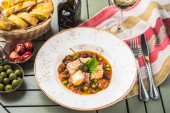Gulasz warzywny i mięsny serwowane na tabliczce na drewnianym stole ze składników