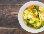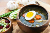 Zupa z warzyw i kurczaka w misce na drewnianym stole