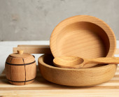Zamknij się obraz drewniane naczynia kuchenne na stół czarny