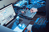Moskwa-16 lutego, 2017: ręka DJ party mix muzyki na scenie z profesjonalnym dźwiękiem mieszania oprogramowania zainstalowanego na laptopie. Sprzęt audio DJ na scenie w ustawieniu oświetlenia koncertowego