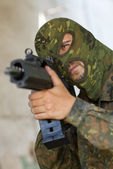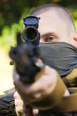 uzbrojony i niebezpieczny człowiek w czarna maska kierowania na zakres optyczny