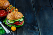 Zdjęcie "Składniki na Burgery na ciemnym tle, widok z góry, kopiować miejsca, rama żywności." może być wykorzystywane do celów osobistych i komercyjnych zgodnie z warunkami zakupionej licencji Royalty-free. Obraz jest dostępny do pobrania w jakości wysokiej rozdzielczości do 5760x3840.
