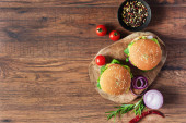 Składniki na Burgery na ciemnym tle, widok z góry, kopiować miejsca, rama żywności.