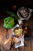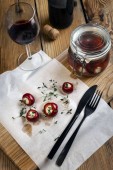 Pieczony kurczak rolki w stylu rustykalnym z kamionki na tle drewniany stół, czarny