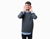 Młody przystojny biznes człowiek nad na białym tle wskazując palcem zaskoczony naprzód, Otwórz usta zdumiony wyrażenie, coś z przodu