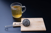 Zaparzania herbaty na stół czarny. Kubek z ciepłego napoju. Ciemne tło.