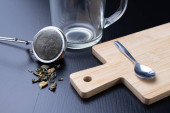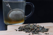 Herbata w papierowej torebce na drewnianym stole. Ciemne tło.
