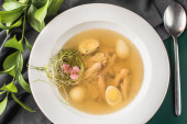 Zupa z makaronem i jajkiem na wierzchu miski na drewnianym stole