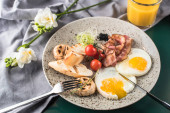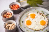 śniadanie z szakszuka, oliwek, papryki, pomidorów, chleb, sok i kawa na rustykalne drewniany stół
