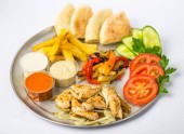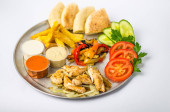 talerz przekąskowy ze świeżych i smażonych warzyw, kurczaka, sosy i chleb na białym tle