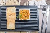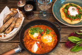 W domu humus przyozdobionym z świeżych warzyw w misce na drewnianym stole