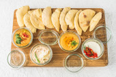 W domu humus przyozdobionym z świeżych warzyw w misce na drewnianym stole