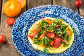 W domu humus przyozdobionym z świeżych warzyw w misce na drewnianym stole