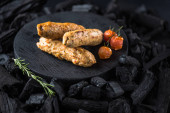 Smażone paluszki z ziołami i przyprawami na ciemnym tle z świeżych pomidorów i tymiankiem