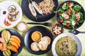 śniadanie z szakszuka, oliwek, papryki, pomidorów, chleb, sok i kawa na rustykalne drewniany stół