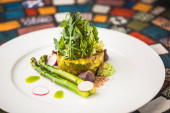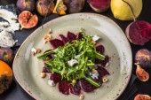 Świeże sałatki z awokado i orzechy w płycie na tle Orientalny wzór