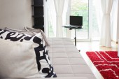 Zdjęcie "Wnętrze przytulne nowoczesne kolorowe sypialnia łóżko arkuszy i geometria kształty konstrukcji" może być wykorzystywane do celów osobistych i komercyjnych zgodnie z warunkami zakupionej licencji Royalty-free. Obraz jest dostępny do pobrania w jakości wysokiej rozdzielczości do 5760x3840.