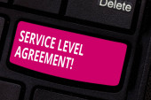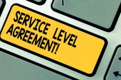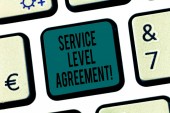 Word pisanie tekstu umowy dotyczącej poziomu usług. Koncepcja biznesowa dla zobowiązań między usługodawcą a klawisz klawiatury klienta zamiar utworzyć wiadomość komputer naciskając klawisz klawiatury, pomysł.