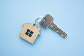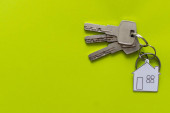 Kluczy od domu z cacko na kolor tła, widok z góry. Miejsca na tekst