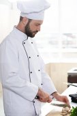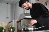 zmęczony mężczyzna szefa kuchni w jednolite dotykając głowy i o ból głowy w kuchni restauracji