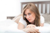 atrakcyjny brunetka dziewczyna poważne leżąc na łóżku i patrząc na kamery