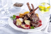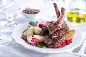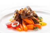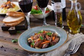 zbliżenie wykwintne danie z wątroby pieczona wołowina i warzywa na talerzu na drewnianym stole
