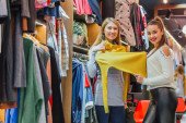 Zdjęcie "Dwóch przyjaciół wybrać swetry podczas zakupów. Czuć się dobrze, uśmiech i śmianie się." może być wykorzystywane do celów osobistych i komercyjnych zgodnie z warunkami zakupionej licencji Royalty-free. Obraz jest dostępny do pobrania w jakości wysokiej rozdzielczości do 5760x3840.