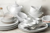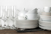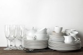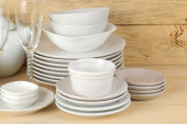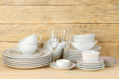 Stos potraw. naczynia na brązowy drewniany stół. naczynia do serwowania tabeli. talerze i sztućce, szklanki, czajnik, szklanki.
