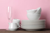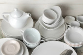 Zdjęcie "Stos potraw. naczynia na brązowy drewniany stół. naczynia do serwowania tabeli. talerze i sztućce, szklanki, czajnik, szklanki." może być wykorzystywane do celów osobistych i komercyjnych zgodnie z warunkami zakupionej licencji Royalty-free. Obraz jest dostępny do pobrania w jakości wysokiej rozdzielczości do 5760x3840.