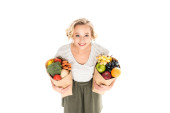 wesoły emeryturze kobieta trzyma worek papierowy z bakalii i pokazuje kciuk znak na białym tle