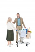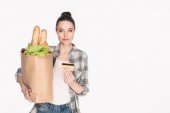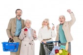 wesoły starszy kobieta trzyma worek papierowy z bakalii i smartphone z pustego ekranu na białym tle