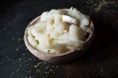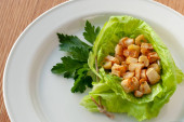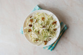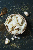 wysoki kąt widzenia niektórych miski z składniki niezbędne do przygotowania xato, kataloński Sałatka z oczyszczonej soli dorsza i escarole endywia, na stół rustykalny zielony ciemny