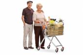 wesoły starszy przyjaciele stojący z koszem i koszyk na białym tle