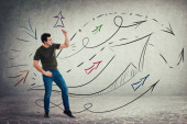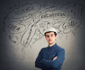 Zdjęcie "Poważne zadumany młodzieniec naukowiec inżynier na sobie kask ochronny ręka pod brodą zamyślony patrząc na białym tle nad tablica z rocket rozpocząć szkic, statek startu w kosmos." może być wykorzystywane do celów osobistych i komercyjnych zgodnie z warunkami zakupionej licencji Royalty-free. Obraz jest dostępny do pobrania w jakości wysokiej rozdzielczości do 5760x3840.