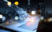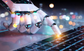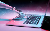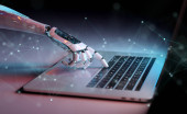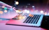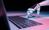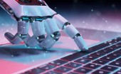 Robot cyborg strony naciskając klawiaturę na laptopie renderowania 3D