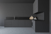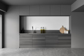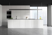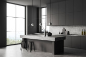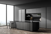 Zdjęcie "Wnętrze nowoczesna kuchnia z szare ściany, kamienne podłogi, ciemne blaty szare, białe szafki i biały bar stołki. renderowania 3D" może być wykorzystywane do celów osobistych i komercyjnych zgodnie z warunkami zakupionej licencji Royalty-free. Obraz jest dostępny do pobrania w jakości wysokiej rozdzielczości do 5760x3840.