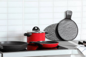 Zdjęcie "Zestaw czyste naczynia kuchenne i naczynia na stół w nowoczesnej kuchni" może być wykorzystywane do celów osobistych i komercyjnych zgodnie z warunkami zakupionej licencji Royalty-free. Obraz jest dostępny do pobrania w jakości wysokiej rozdzielczości do 5760x3840.