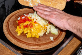 Naczynia żaroodpornego z ratatouille napełniania, składający się z pomidorów, cebuli, papryki, makaron, czosnkiem i serem