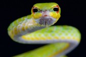 Zielona północ Philippine Temple pitviper na ciemnym tle, zbliżenie