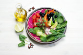 Zdjęcie "Ser Camembert, nasiona granatu, wymieszać Sałatka z młodym szpinakiem, rukolą, liście buraków, wapno i orzechy na zielony talerz. Smaczny, wykwintna kuchnia" może być wykorzystywane do celów osobistych i komercyjnych zgodnie z warunkami zakupionej licencji Royalty-free. Obraz jest dostępny do pobrania w jakości wysokiej rozdzielczości do 5760x3840.