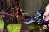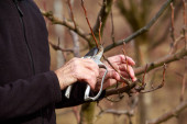 Przycinanie krzewów podczas słoneczny zimowy dzień, zbliżenie na ręce i motoryczna sekatora