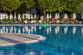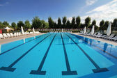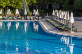 GARDA, WŁOCHY - WRZESIEŃ 2018: Basen olimpijski w Hotelu Poiano na obrzeżach Garda nad jeziorem Garda, z odbiciami parasoli przeciwsłonecznych w spokojnej wodzie.